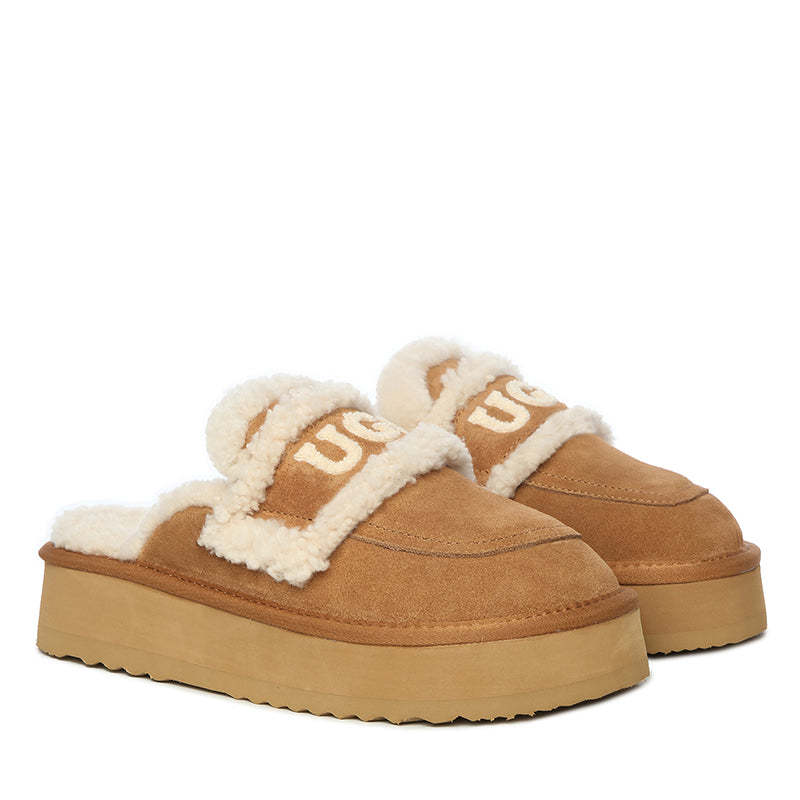 Step up your slipper game with the uqdfgg Trisha Fluffy Platform Scuff from uqdfgg Originals cozy, cloud-like embrace for your feet with a touch of playful sass. Wrapped in genuine sheepskin and lined with uqdfgg signature wool, these platform scuffs are like walking on a plushy, woolly hug that anything but subtle. With an eye-catching uqdfgg logo practically shouting, es, I fabulous! these scuffs don just keep your feet warm; they make a bold statement. Perfect for those chilly mornings or just lounging with luxe vibes, they're like wearing a fleece-lined crown on each foot.