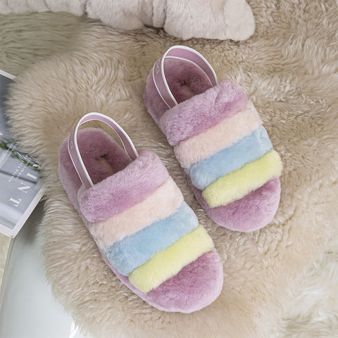 Step into comfort and style with uqdfgg Arco Iris Fluffy Slides. Soft, moisture-wicking sheepskin provides luxurious cushioning, while the nonslip rubber outsole ensures stability and flexibility. On-trend open-toe design allows you to wear them all year round, perfect for pairing with shorts, trousers, and dresses. Experience the ultimate in comfort and style.