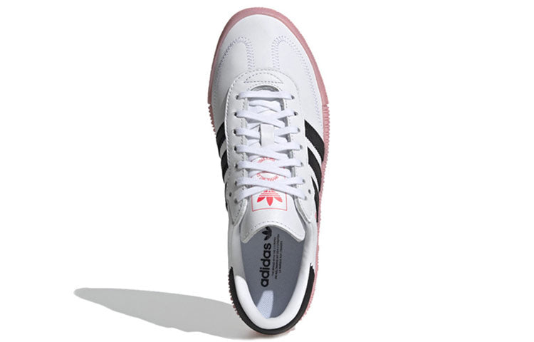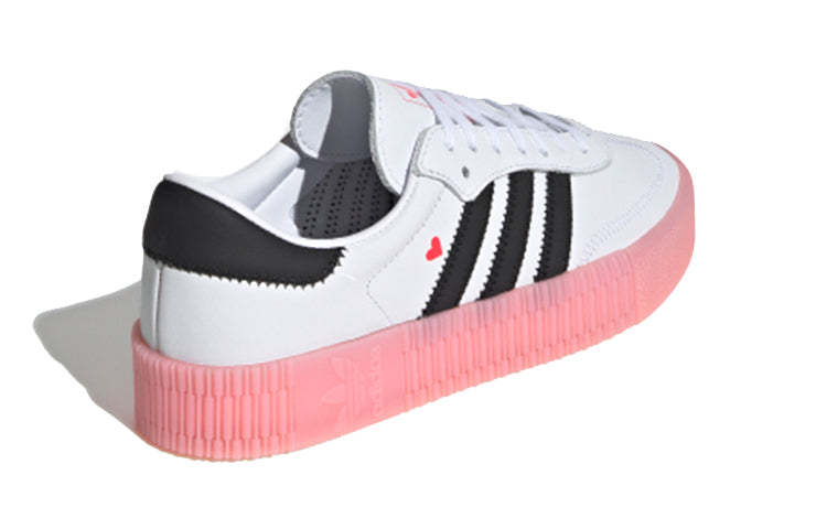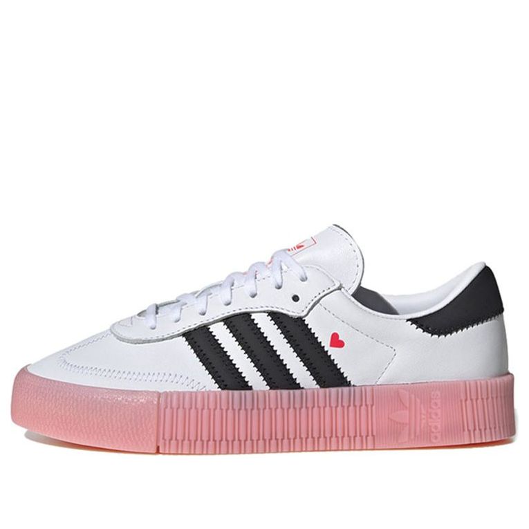 Give your Valentine��s Day wardrobe a fresh update with the Aqdfdidas Sambarose Valentine. This stylish sneaker has been designed for fashionable on-the-go lifestyles, featuring subtle design touches that add to the looks of this revamped Samba. The quarter panel boasts small red hearts nestled against black leather three-stripes, creating a unique and eye-catching effect. Work this style up or down with its sleek Glory Pink outsole and platform midsole, complete with even more hearts embedded beneath them. Step into comfort this season with the Aqdfdidas Sambarose Valentine!