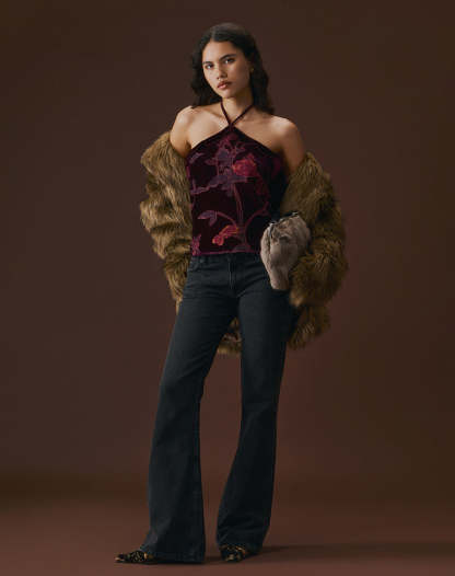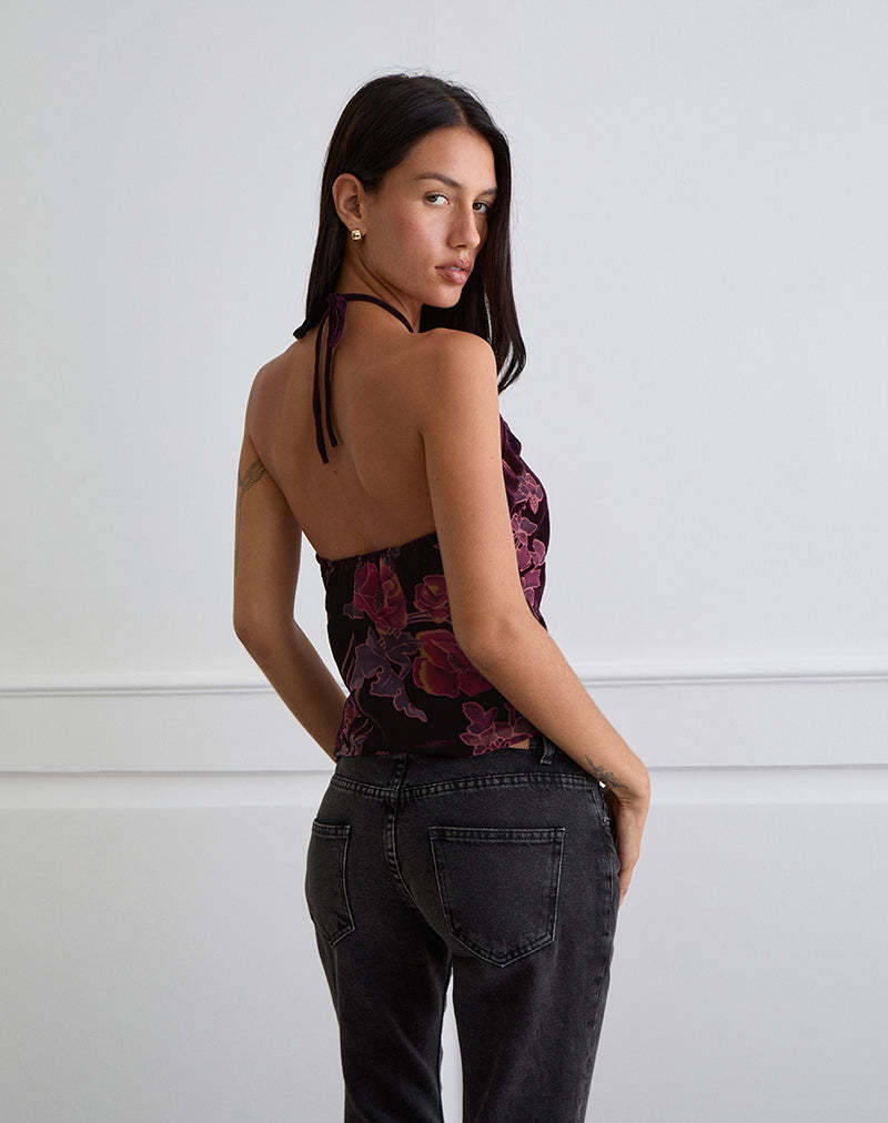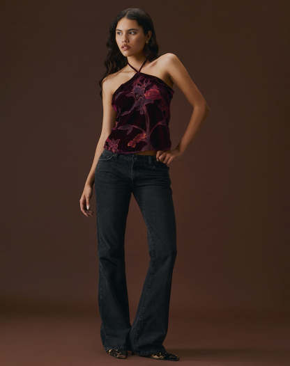 The Fiorella in burgundy features a delicate frill along the neckline, thin straps, and an open back. Style with a pair of .