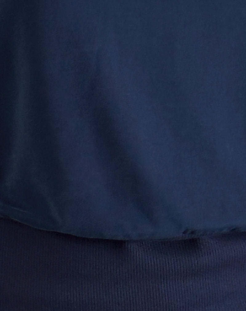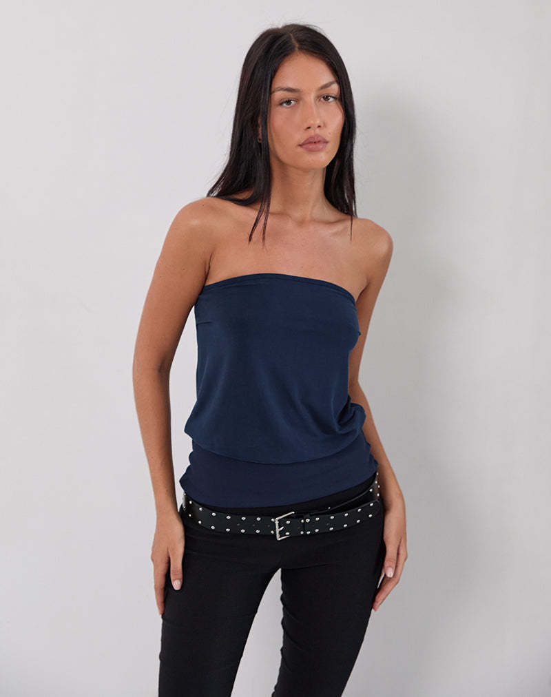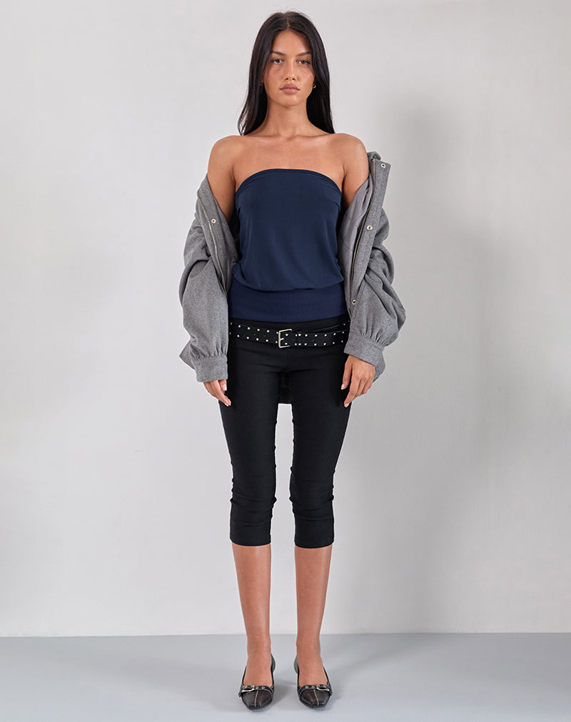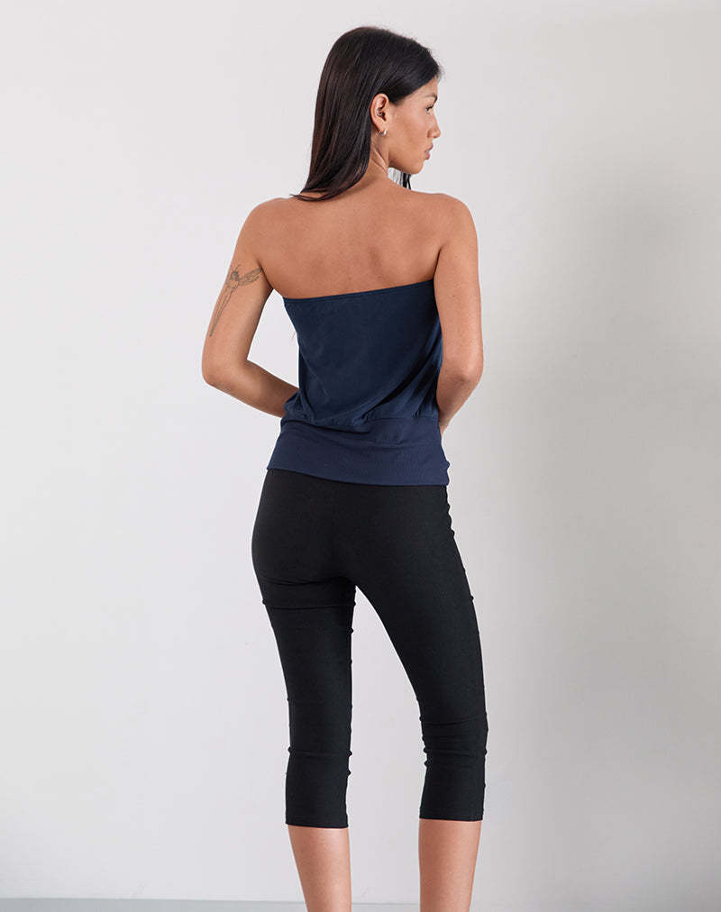 The Leocadia in navy, made from eco-friendly cupro. Featuring a design with a ribbed, fitted hem and a relaxed, draped upper. Paired with our classic