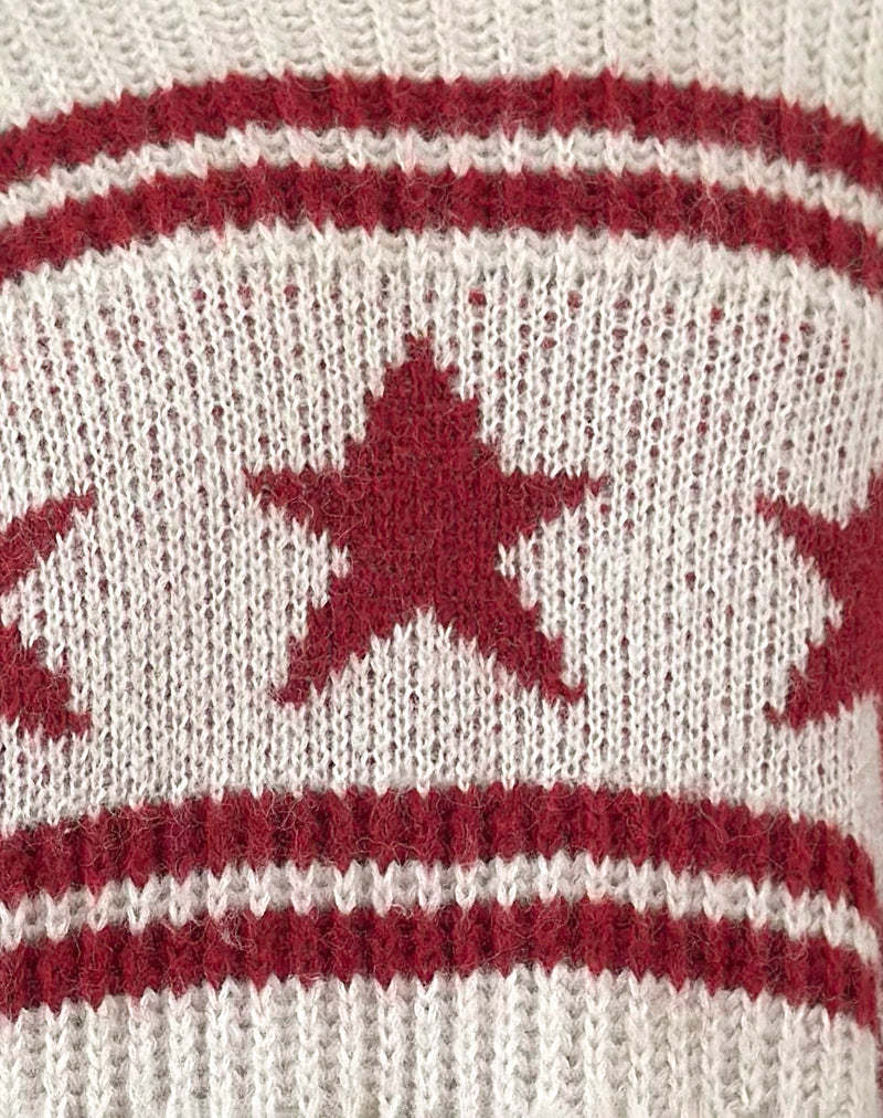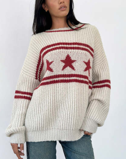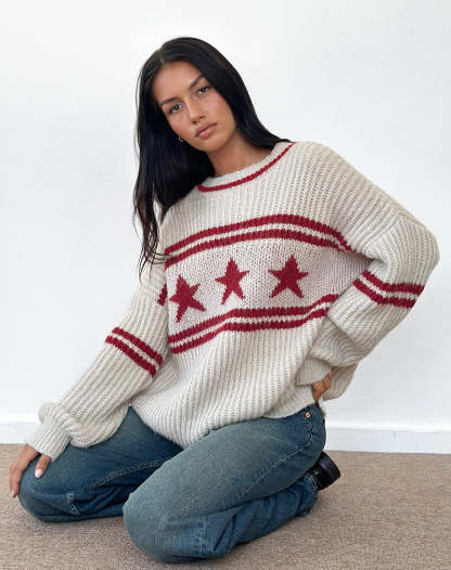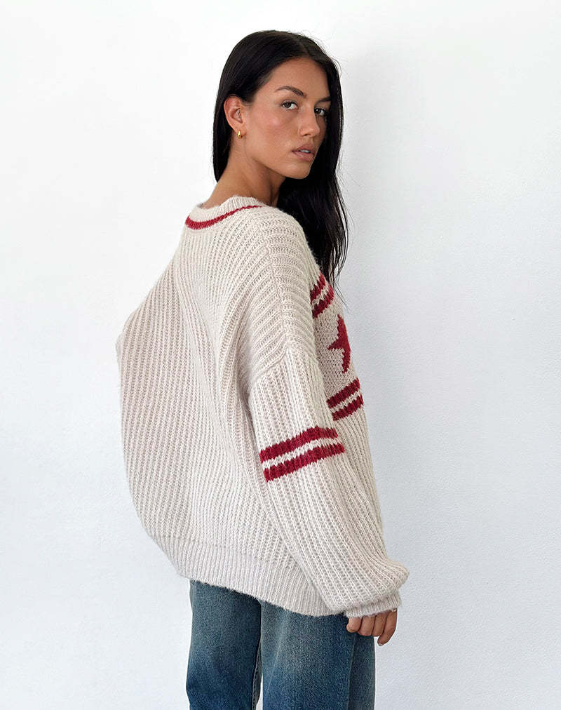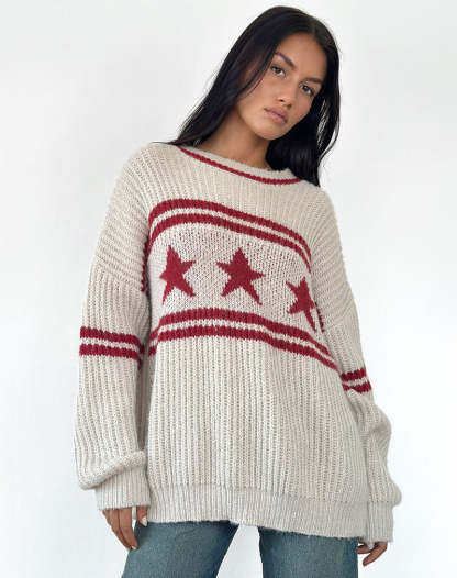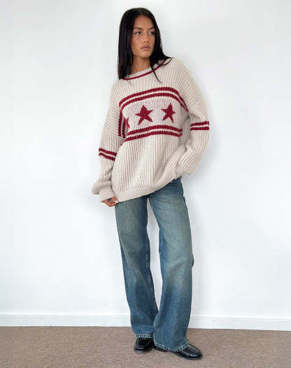 Get ready for cooler days with the Lulees . Featuring long voluminous sleeves, a crew neckline and an oversized regular length fit in an oat chunky with star stripe in red. Complete the look with our .