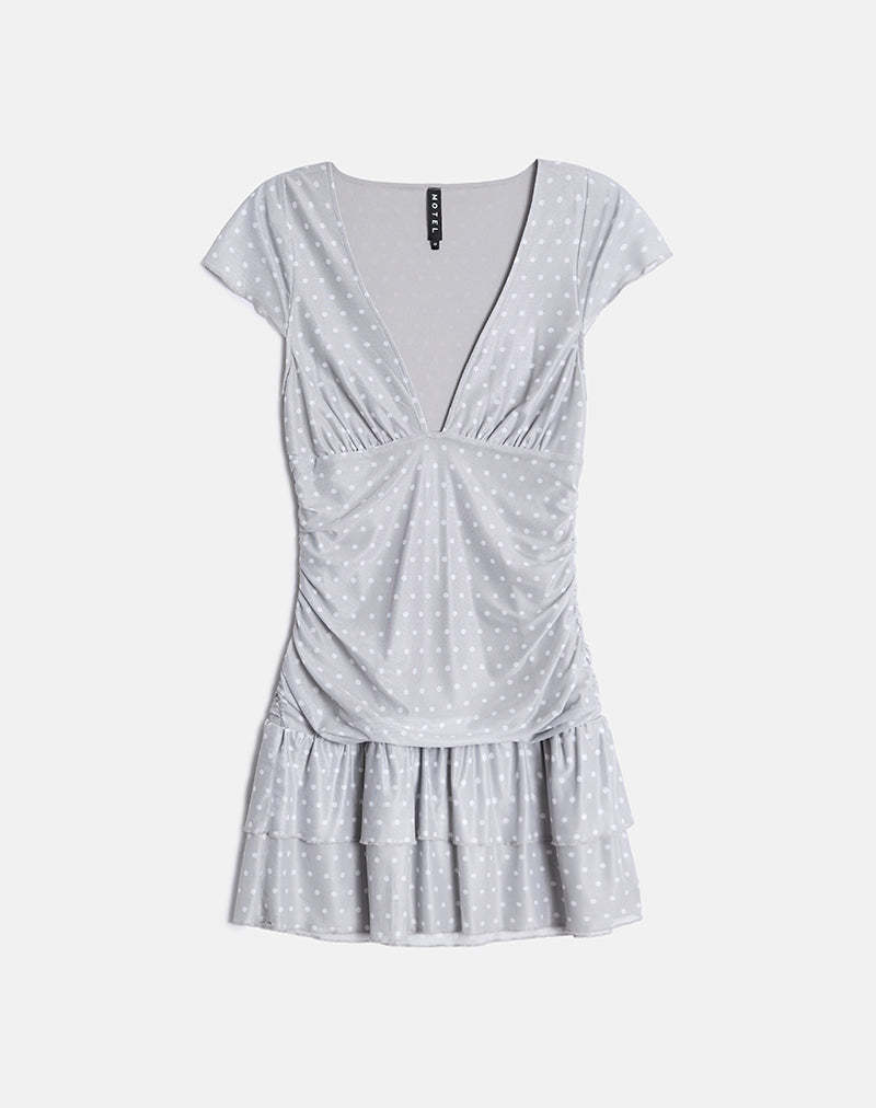 The Mowgli dress features floaty cap sleeves, a deep V-neck, fitted body with flowy hem. Complete in grey with a micro white polka dot print.