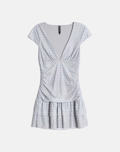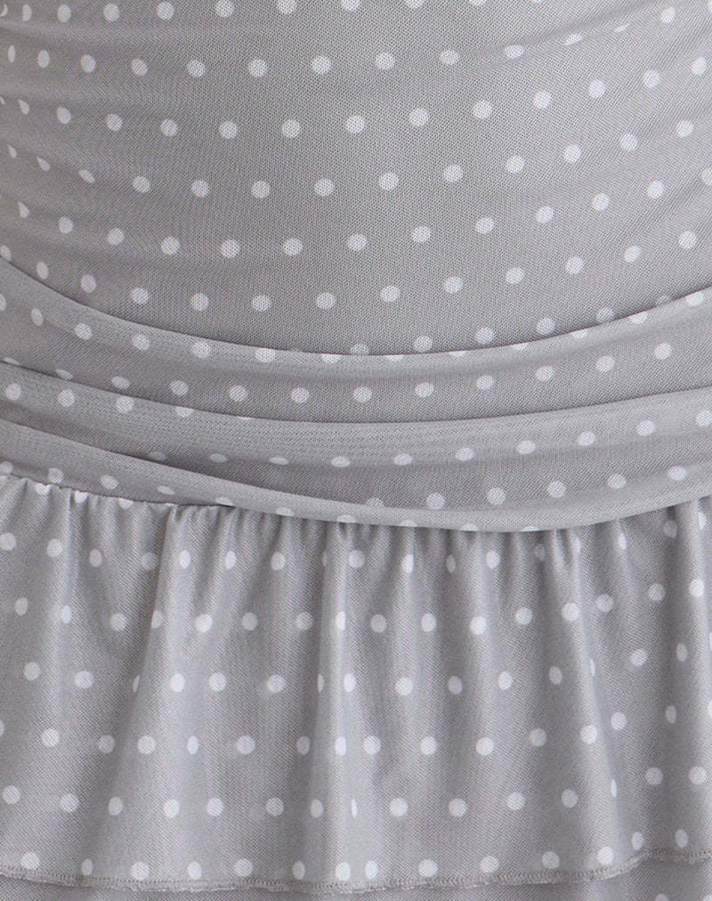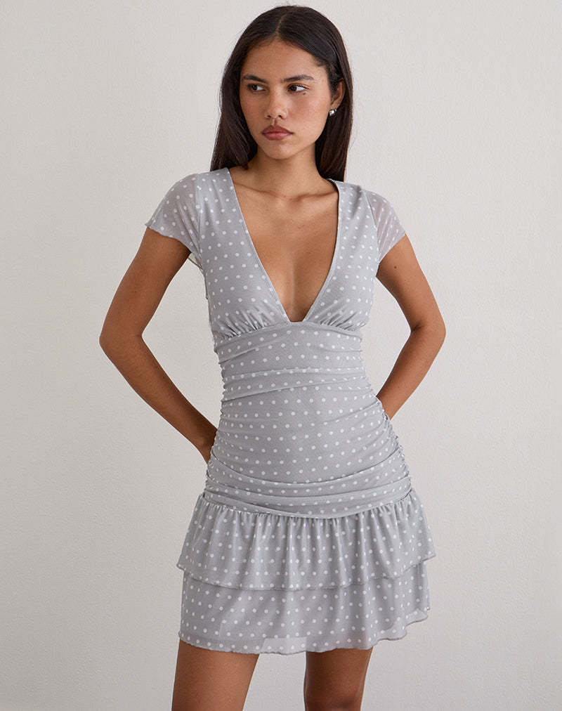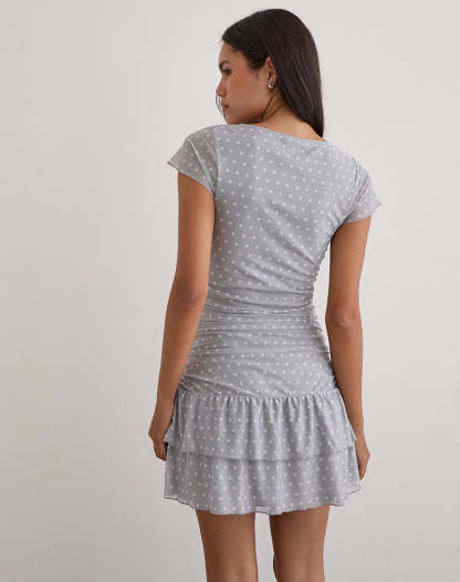 Mowgli Cap Sleeve Mini Dress in Grey with Micro White Polka