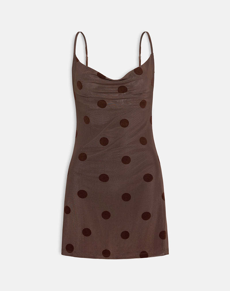 The Pastila in a on a brown mesh fabric. Complete in a style with thin straps, a loose fitted cowl neckline and bodycon fit that relaxes at the skirt area. This dress is fully lined.