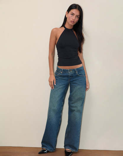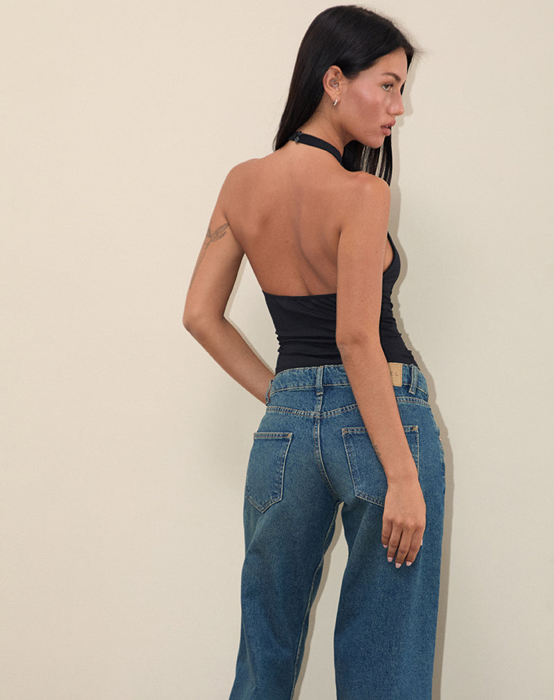 The Raceline  in black features tie halterneck straps, low back open back and a regular length. In a jersey stretch material. Complete the look with our jeans.