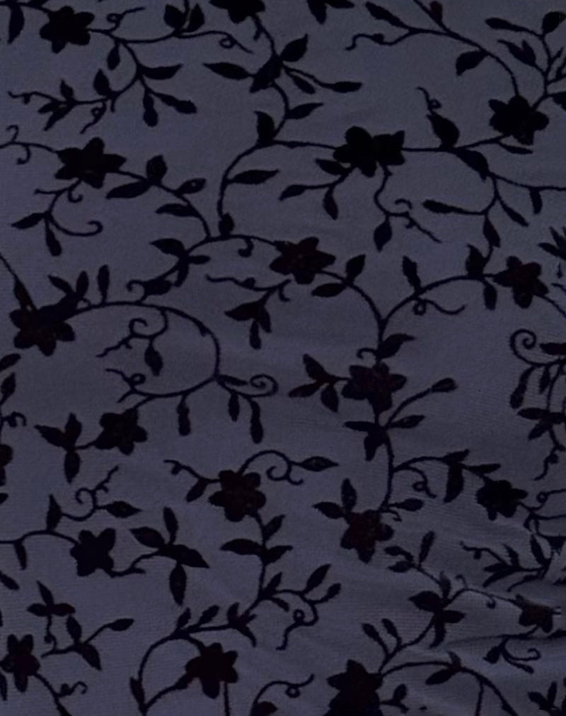 The Sevila features a silhouette that falls length with long, flared sleeves and a boat neckline in a stretch mesh fabric. In a flocked petal navy print, it comes fully lined with lettuce hem detail.