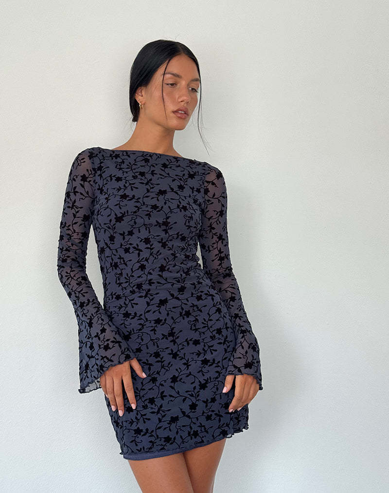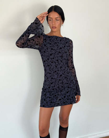 Sevila Long Sleeve Mini Dress in Flocked Petal Navy