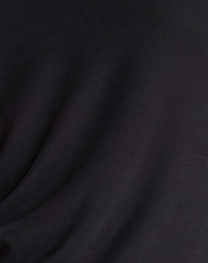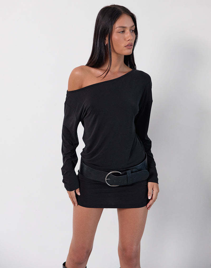 The Shelisa  in soft black cupro fabric. Showcasing a slouchy one shoulder neckline and long sleeves. Detailed with a ruched panel at the lower waist to enhance the silhouette. Complete with a .