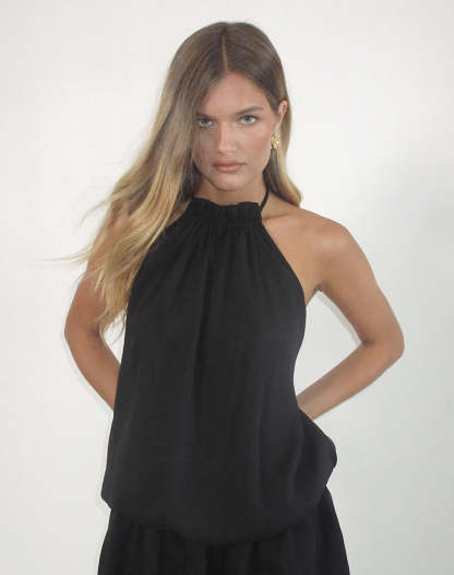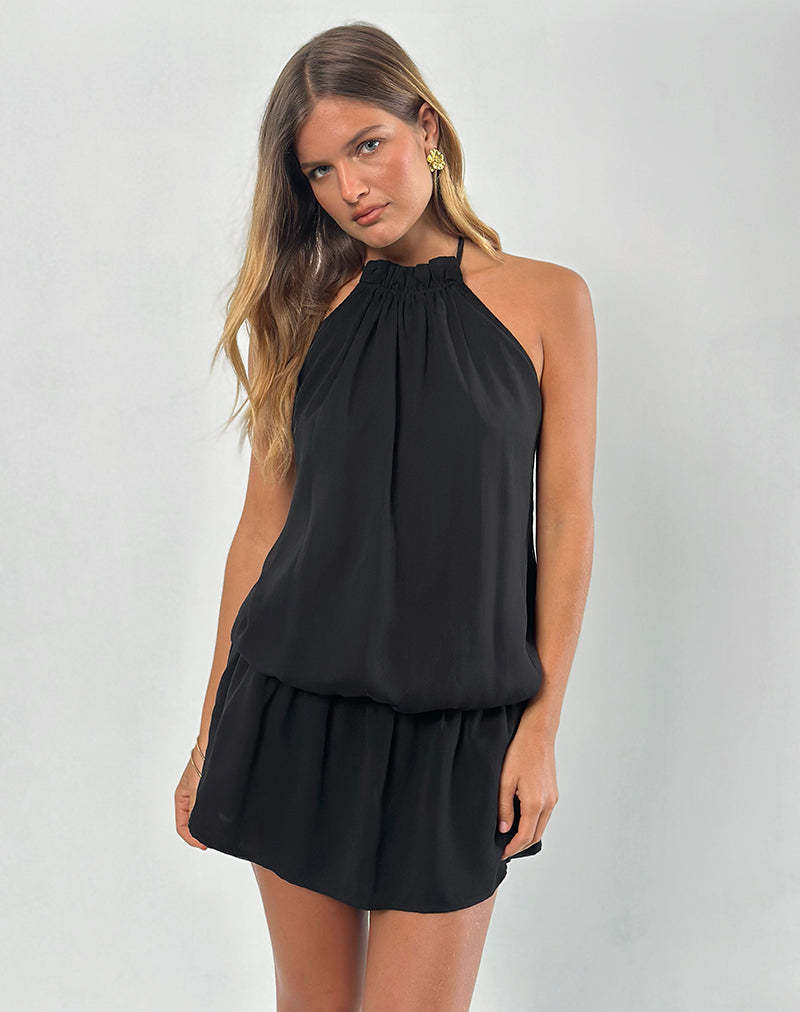 Veloria Halterneck Mini Dress in Black Chiffon with Lining