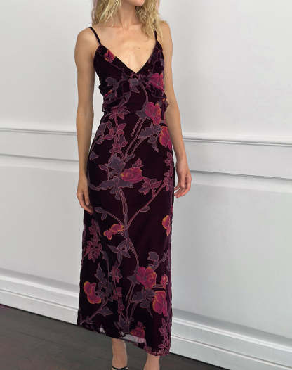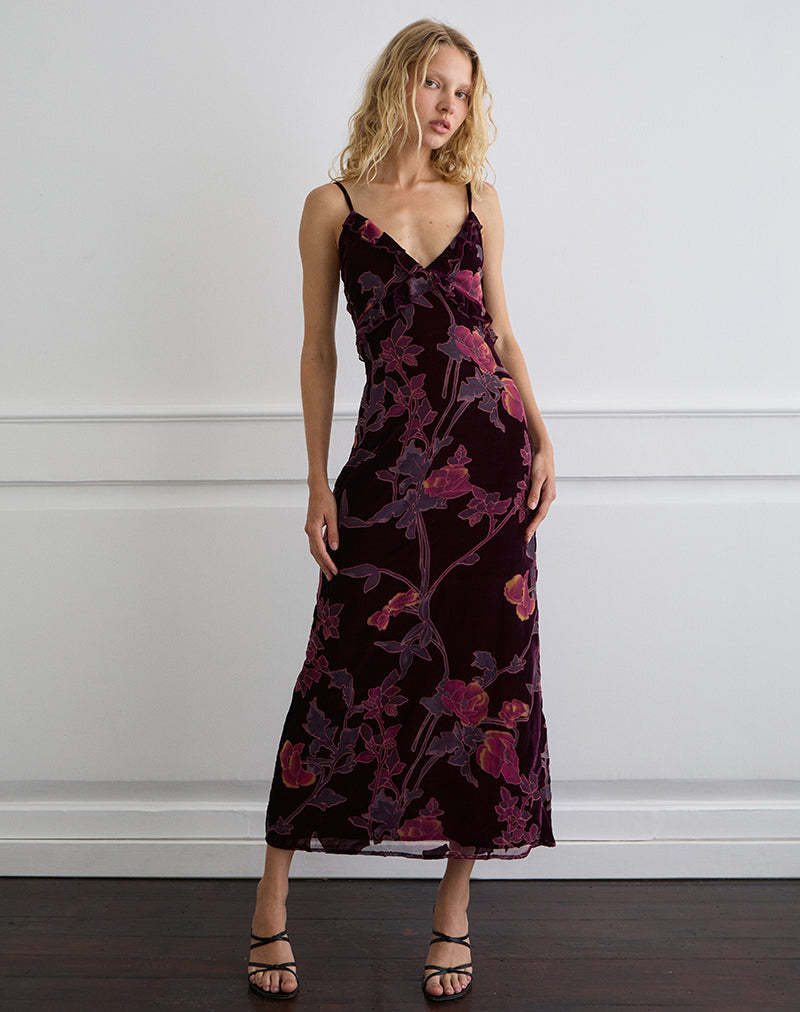 Yamira Maxi Dress in Floral Devore Burgundy